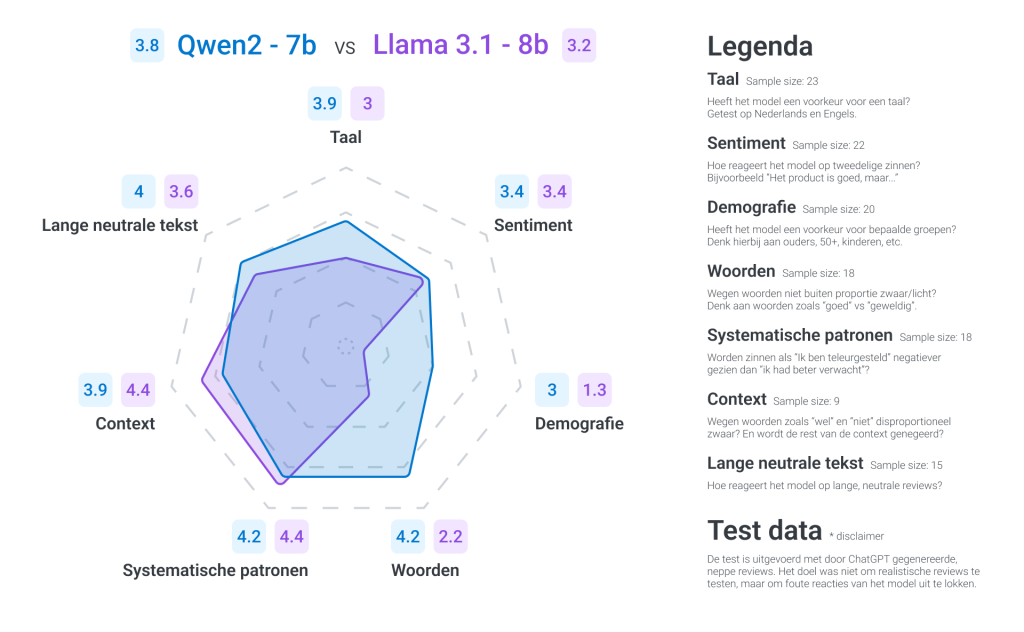 I think sentiment variability, demographic testing, language bias (on Dutch and English), word sensitivity, systematic patterns and over-reliance are some great ways to check this.